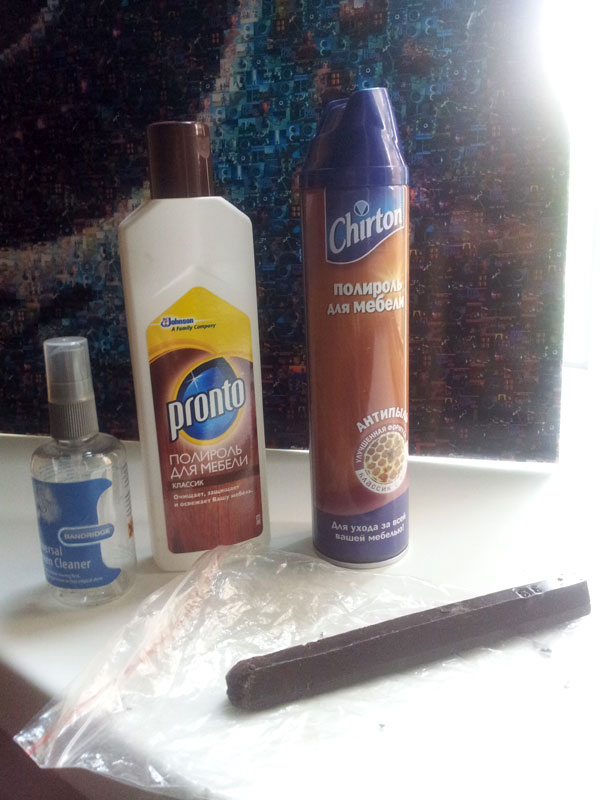Для дерева - пара полиролей - пожиже и погуще. Для смывания грязи замечательно подходят жидкости для чистки мониторов и тд, для техники, в общем - не оставляет следов и разводов. А металл шикарно блестит после полировки жидкостью для мытья окон. Самой обычной, какая в доме нашлась Самое экзотичное - это карандаш для сколов, его мне посоветовал кто-то на форуме (как и фломастеры ). Купил в ближайшем строительном магазине, взяв с собой маленькую деревяшку от корпуса для подбора цвета - там их целая палитра. Сначала помучился, пока не приспособился - он похож на пластилин, то есть не закрашивает скол, а заполняет его. И заставить его там держаться и выглядеть незаметно получилось не сразу. На фотке этот карандаш, а вот название фирмы не знаю, просто "карандаш для мебели" спросил в магазине..
