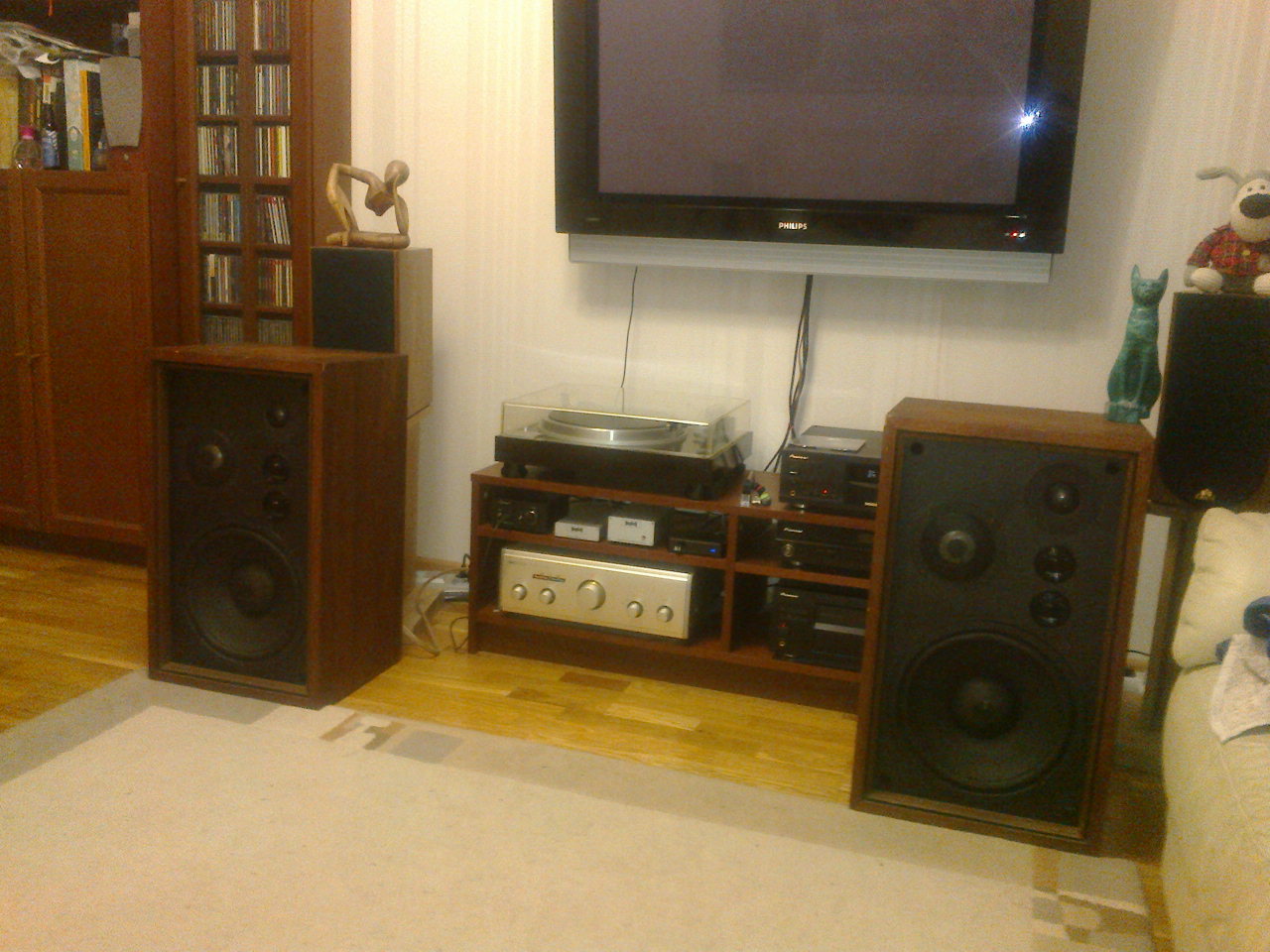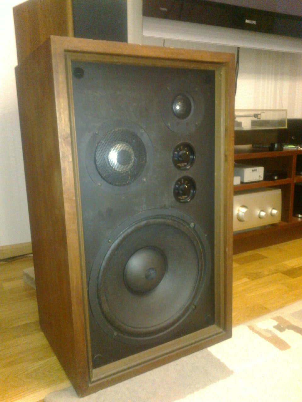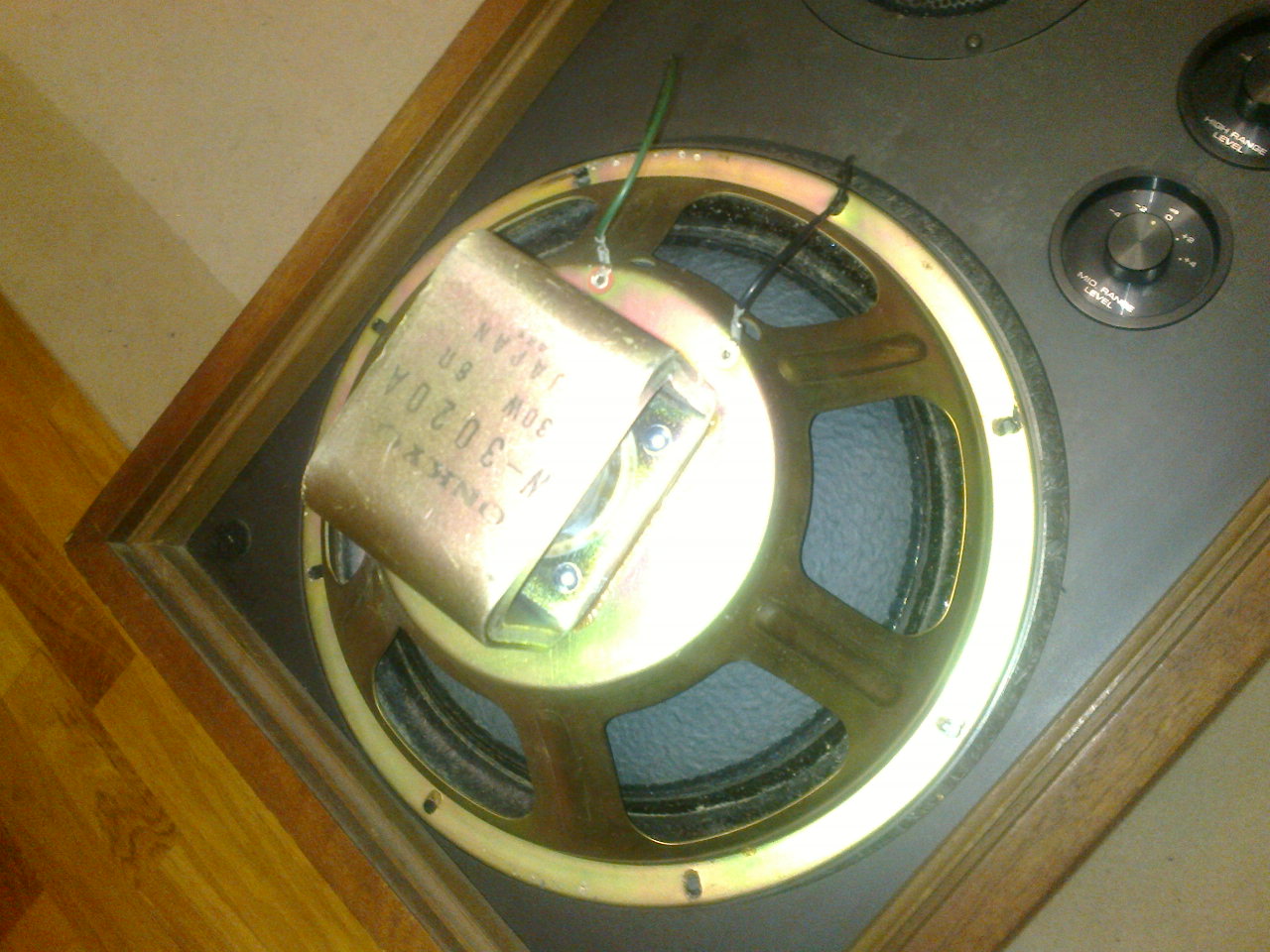 Итак Onkyo E-63A mkll примерно 1973 года выпуска. Бас - 30см бумага, причем тыльная сторона какая то хитрая, подвес из тряпки, изнутри даже еще пропитка липкая, магнит альнико. СЧ и ВЧ купольные из дюралюминия. Корпус нужно будет освежить. Внутри три ребра жескости, две на задней стенке и одна на передней. Забито всё шерстяными матами. Сзади панель с кучей терминалов и переключателем для полного диапазона, для би-ампинга и для три-ампинга. Там уйма проводов, которые могут говнять сигнал (плюс еще и на передней панели пара галетников). Чуть чуть погонял и решил потрошка проверить, почистить, помыть и может кое что, при необходимости, заменить