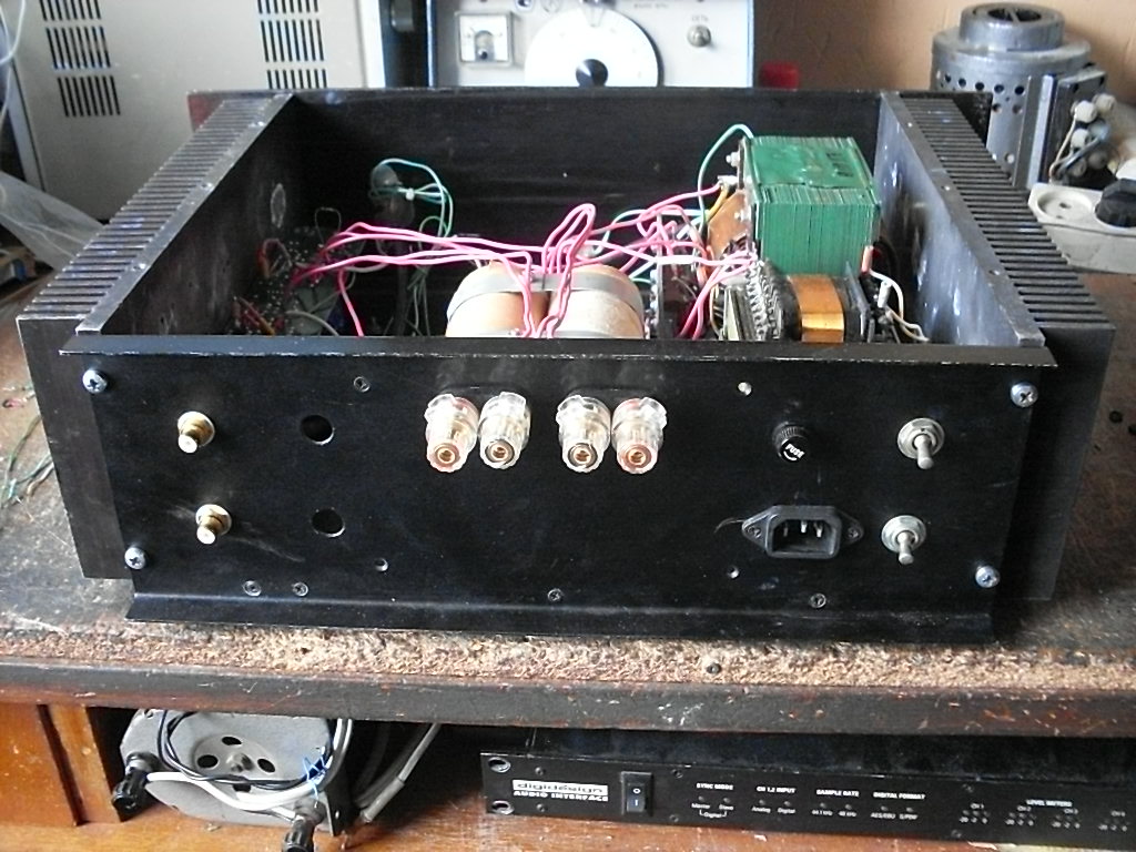 Хорошо видны два силовых трансформатора и тумблёр на заднитце, "переключатель сопротивления нагрузки" - для четырёх и восьми Ом оптимально разное напряжение питания.