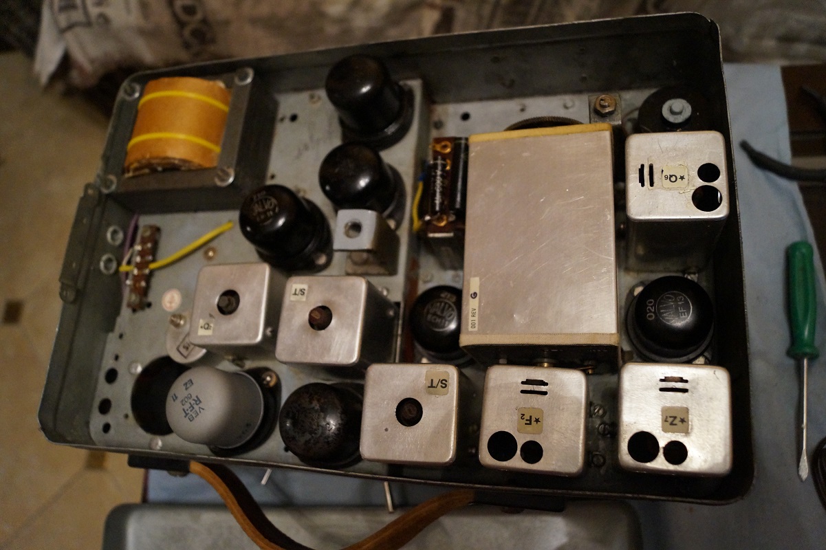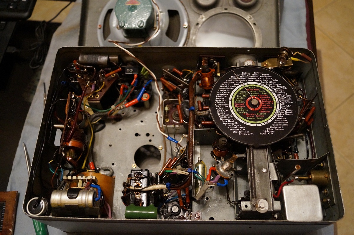 Начал с R2, снял переднюю и заднюю крышки. С трудом верится, что аппарату 80 лет. Черные лампы Телефункен, только одна наша, кажись это кенотрон. Явно неродной потенциометр громкости). R3 наверное гляну завтра, он конструктивно посложнее, с гетеродином.