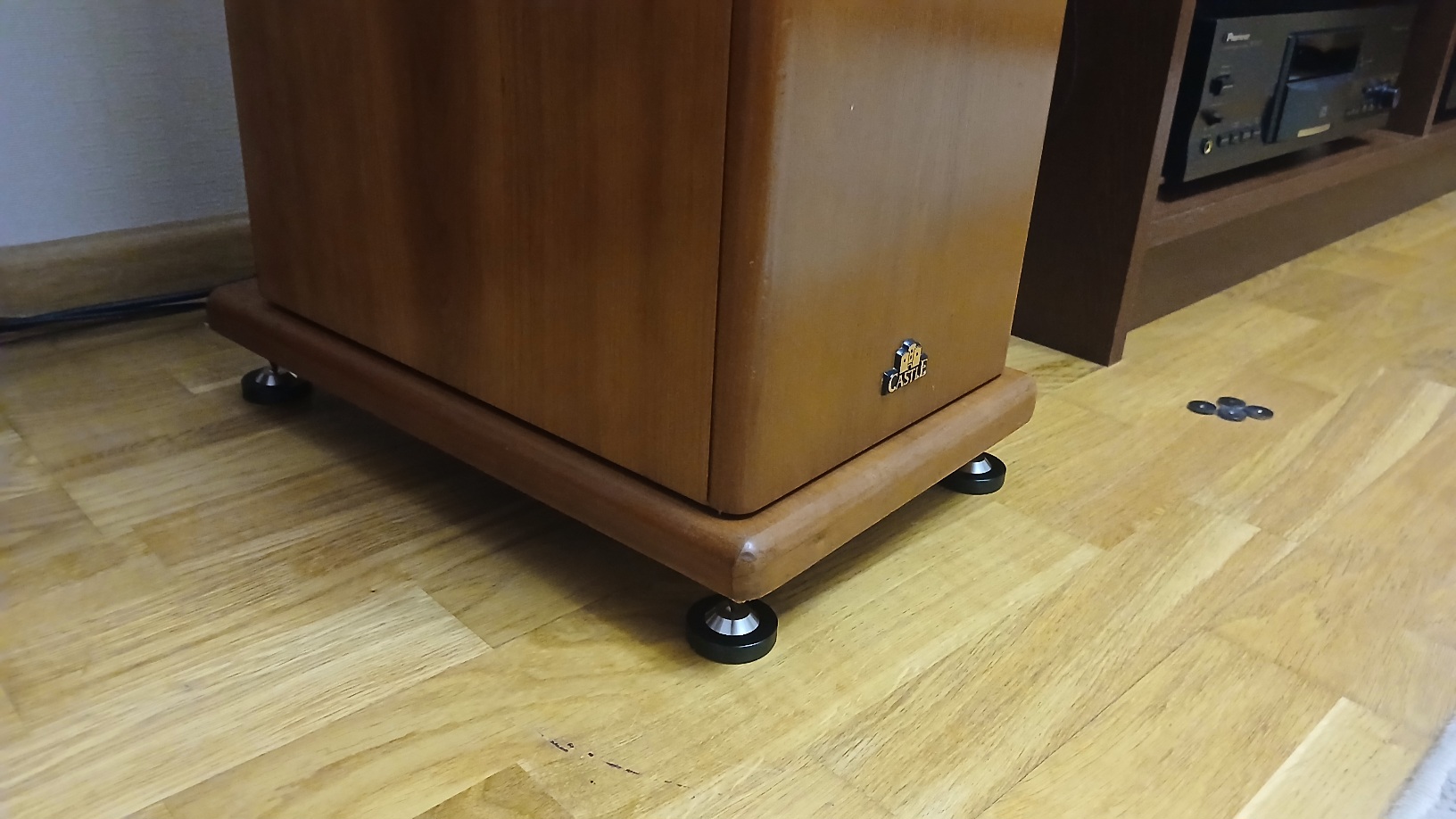 А если серьезно, то это тот не очень частый случай в моей практике, когда без шипов не айс. Нижняя отражательная доска, в просторечии плинт, очень сильно вибрирует от того, что в неё "дует" выход четвертьволнового резонатора. Если на пол ставить как есть, то пол начинает вибрировать, возникает гулкий низкочастотный призвук. На шипах бас строже – пол не подыгрывает. А подпятников штатных у меня нет. Да там и не подпятники, а типа жестких резиновых чехольчиков на шипы, с расширением книзу. Монетки я делал как временное решение, а прожил с ними два года