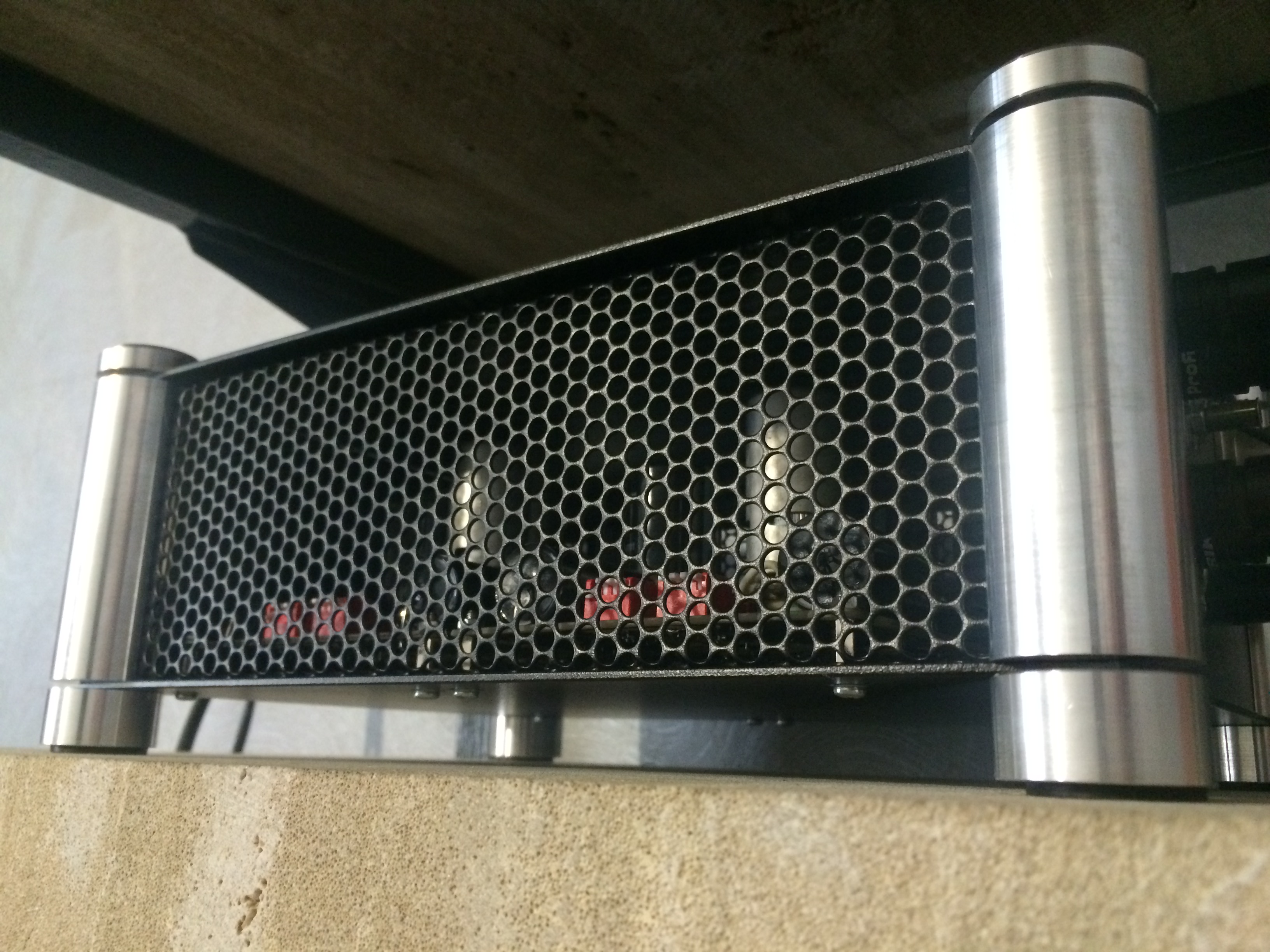 предлагаю на фронтальных частях ламповых защитных экранов сделать вырезы позволяющие вытекать ламповому свету, внешние поверхности экранов зачернить (покрасить), что создаст неповторимую камерную атмосферу во время прослушивания. наводки на лампы не должны сильно увеличиться, так как сам корпус по конструкции - суть большой экран.