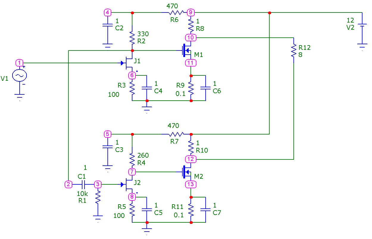 На прилагаемом рисунке представлена упрощенная схема макета, собранного в железе, он обеспечивал мощность около 2 Вт на нагрузке в 8 Ом(при Кг менее 1 %), КПД схемы составляет около 3 %)) Сравнимо с ламповыми однотактниками)) Необходимость применения псевдо балансной схемы обусловлена необходимостью компенсации 2 гармоники, уровень 3 гармоники составляет 0.2-0.3%. Усилитель обладает ровным, мягким и в то же время очень и четким и детальным звуком, в свое время сравнивал его с однотактом на 300В, однотакт с треском проиграл и хозяин однотакта стал хозяином этого макета))